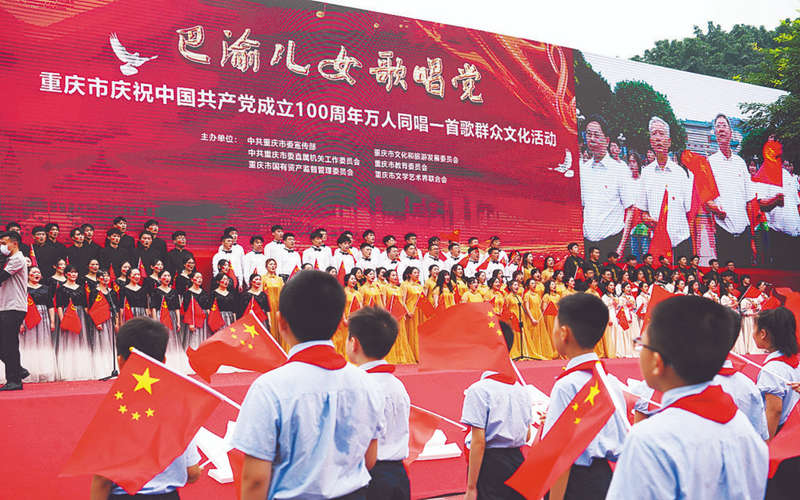 昨天上午,“巴渝兒女歌唱黨”——重慶市慶祝中國共產黨成立100周年萬人同唱一首歌群眾文化活動在重慶人民廣場舉行。11個區縣設立分會場。先進人物、模范代表、青少年學生、社會各界群眾歡樂齊聚,以多地聯動、傳唱經典頌歌的方式,慶祝黨的百年華誕。