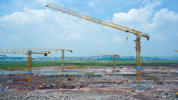 在位于江北機場T3A航站樓北側的施工現場,20余臺塔吊整齊排列,正在進行有序的吊裝作業。挖掘機、推土機、鉤機等施工機械轟鳴忙碌,運土車、灑水車等工程車輛來回穿梭,現場一片熱火朝天的景象。