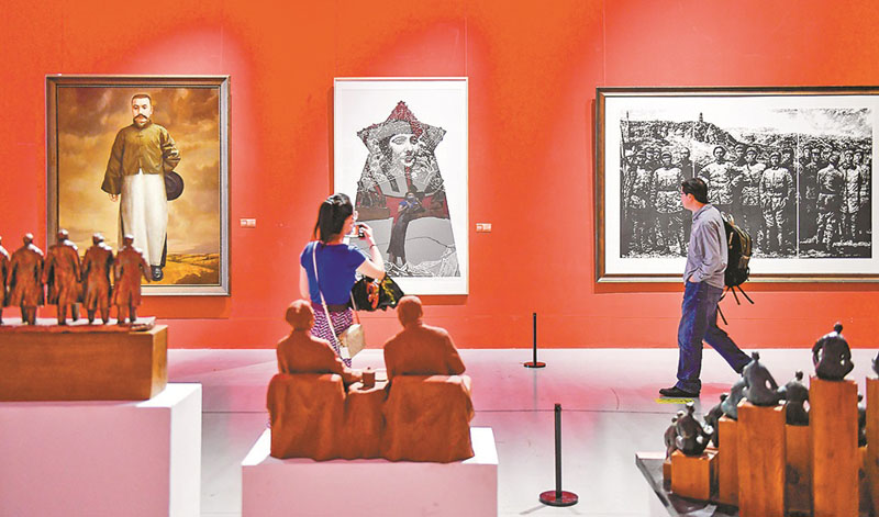 油畫《黑暗中的明燈——中共南方局》、黑白木刻《不忘初心——記鄧小平從巴黎油印博士到瑞金紅星報主編》、綜合畫種《嘉陵新岸》、“幸福之路——全面小康”主題雕塑……藝術家們圍繞黨史中的重大題材、重要節點,黨團結帶領人民進行革命、建設、改革取得的偉大成就,新時代發生的歷史性變化等創作的精品力作,讓觀眾領略到信仰之美、初心之美、奮斗之美、自信之美,令人印象深刻。