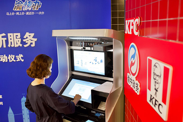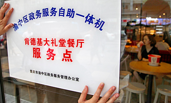 今年7月份,這項便民舉措再次升級。在重慶市商務委和重慶市政府電子政務辦的指導下,重慶肯德基與渝中區政務辦達成合作,將計劃進駐社會新業態的首臺“渝快辦”智能終端放在了肯德基大禮堂餐廳,將“為群眾辦實事”落在了實處。