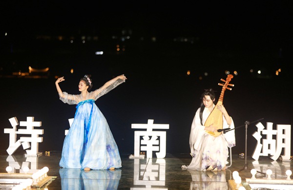 晚上8點,隨著音樂的響起,一曲漢服舞蹈《長安啊》也正式拉開了首屆“詩話南天湖”文化采風誦讀活動的序幕。云霧慢慢散開,舞蹈演員身著藍裙,綰起長發,在湖面翩翩起舞,旋轉、跳躍、臥倒……融入在南天湖天地之中。一曲暫罷,陣陣掌聲響起,湖面也泛起陣陣漣漪。