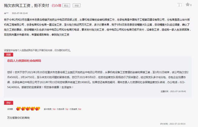人民網重慶7月26日電 (陳琦)“我于今年2月和3月在重慶市忠縣烏楊鎮天地藥業中電四項目部上班,從事機電設備的安裝和焊接工作,總承包商和分包商一直沒發工資,至今拖欠我近兩萬元工資,多次討要未果!苯,重慶網友徐先生在人民網“領導留言板”求助。收到留言后,忠縣人力資源和社會保障局勞動監察支隊多次與分包、總包企業溝通協調。7月15日,拖欠工資19080元已全部結清。7月21日,徐先生在人民網“領導留言板”上為辦理單位點贊留言:“萬分感激你們的幫助”!【留言原文鏈接】