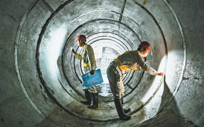 7月26日,西部(重慶)科學城,110千伏學山南北線三標段施工現場,工作人員正在檢查隧道壁。