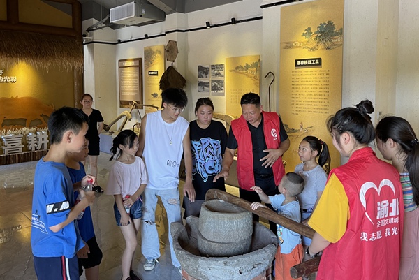志愿者為孩童講解農耕用具。渝北區委宣傳部供圖