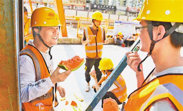 8月3日下午5點過,天氣炎熱,軌道交通10號線蘭花路站施工現場,工人們聚在一起吃西瓜,準備開始下午的工作。