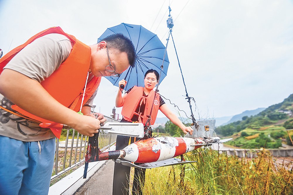 8月8日,開州區臨江水文監測站,黃菁玨(左)和孟釔杉(右)正在安裝水流監測設備。首席記者 龍帆 攝/視覺重慶