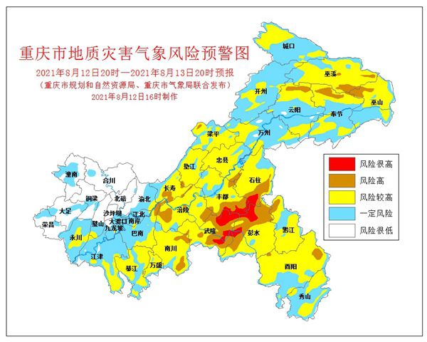 8月12日20時至8月13日20時,豐都縣、石柱縣、彭水縣、武隆區屬于風險很高地區,地質災害氣象風險等級為一級(紅色預警),涪陵區、忠縣、長壽區、梁平區、墊江縣、南川區、黔江區、酉陽縣、巴南區、云陽縣、巫溪縣、奉節縣、巫山縣屬于高風險地區,地質災害氣象風險等級為二級(橙色預警),城口縣、開州區、萬州區、秀山縣、江津區、綦江區、萬盛經開區、渝北區、江北區、南岸區、永川區、璧山區屬于風險較高地區,地質災害氣象風險等級為三級(黃色預警),榮昌區、潼南區、合川區、銅梁區、大足區、北碚區、渝中區、兩江新區、沙坪壩區、大渡口區、九龍坡區屬于一定風險地區,地質災害氣象風險等級為四級(藍色預警)。