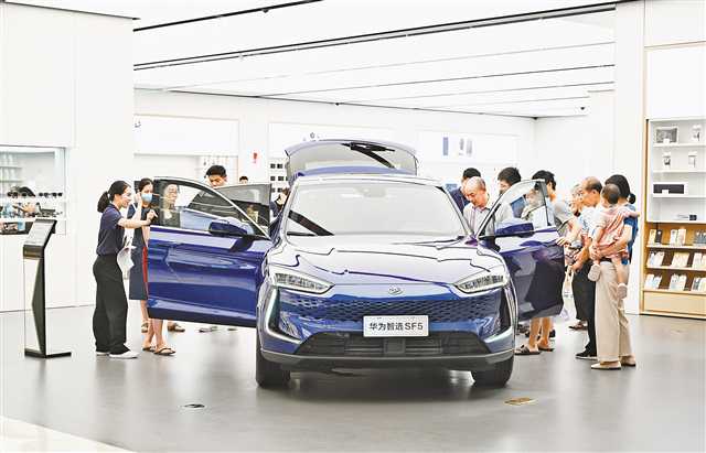 七月三日,沙坪壩區金沙天街購物中心,華為門店內銷售的賽力斯新能源車吸引了眾多市民駐足。(資料圖片)記者 蘇思 攝\視覺重慶