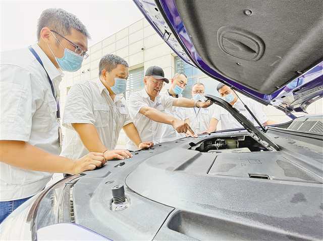 八月十日,吳禮軍(左二)正在和同事研究長安新車型的產品競爭力。(長安汽車供圖)