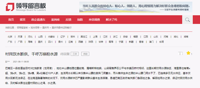 8月11日,蔣志超和當地村民通過人民網“領導留言板”給重慶市委書記陳敏爾留言,反映了群眾生活用水得不到保障的問題。希望相關部門及時解決居住在這里村民的“吃水難”。