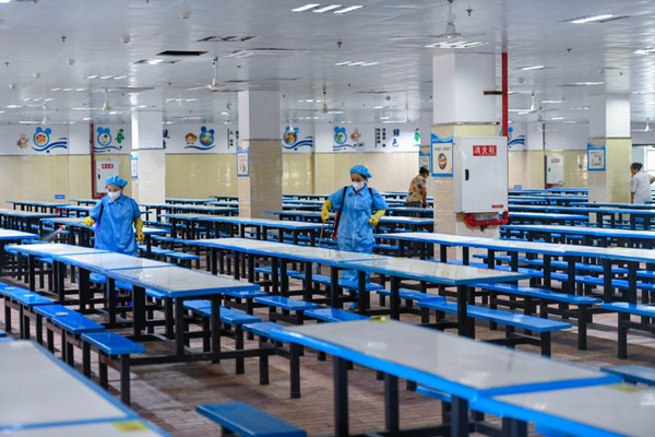 重慶科學城康居西城小學校,工作人員對食堂進行全面清洗和消毒。鄒樂攝