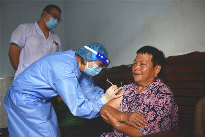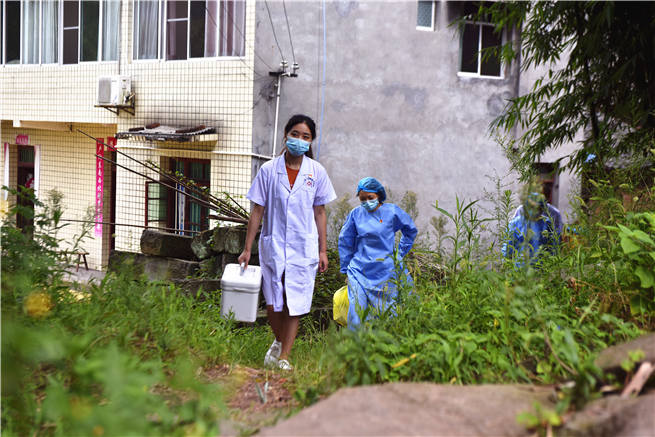 在三江街道龍塘村,當地社區衛生服中心的醫務人員挨家挨戶為村民宣傳和疫苗接種。