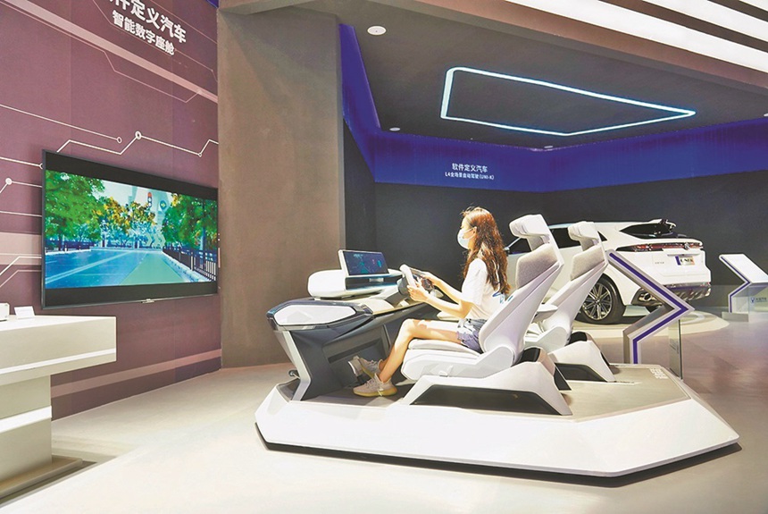 8月22日,重慶國博中心2021智博會現場,媒體記者體驗軟件定義汽車智能數字座艙。