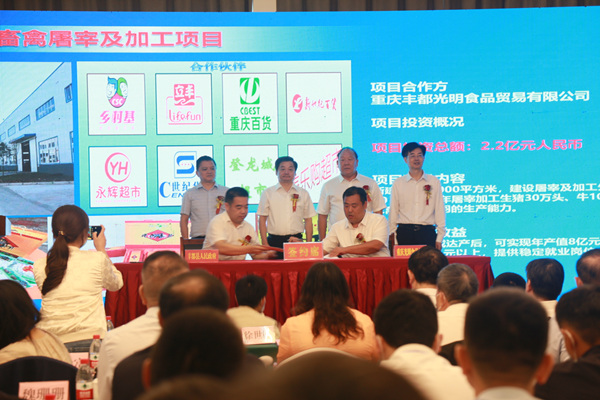 此次簽約的畜禽屠宰及精深加工項目,投資總額2.2億元,由重慶豐都光明食品貿易有限公司投資建設。將新建廠房18000平方米,建設屠宰及加工生產線10 條,配套建設5萬噸冷庫一座,具備年屠宰加工生豬30萬頭、牛10萬頭、家禽5000萬羽的生產能力。項目全面建成達產后,可實現年產值8億元以上,年利稅0.5億元以上,提供穩定就業崗位 300個以上。