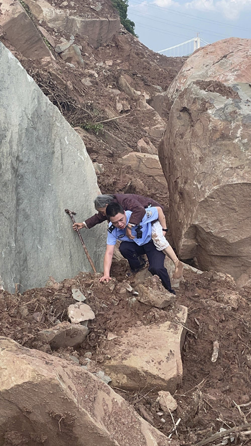 民警背著老人艱難地穿過塌方路段。萬州區公安局供圖