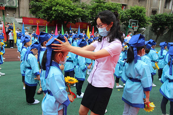 開學典禮上,向陽小學老師幫助孩子們正衣冠。向陽小學供圖