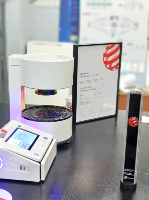 重慶大學的這件作品《磁流體演示儀》,設計團隊由重慶大學藝術學院副教授夏進軍、范正妍與重慶大學光電工程學院副教授謝磊共同組建,該作品參與了2021年度紅點設計大獎設計概念類(design concept)的評選。