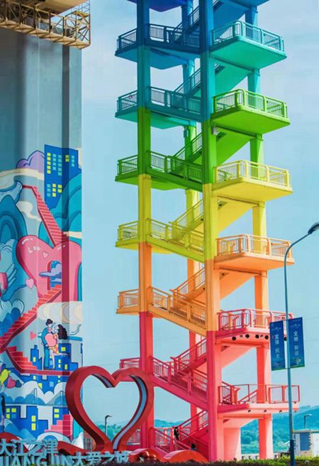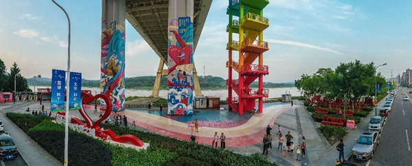 愛情文化長廊充分利用生態景觀游線將愛情文化的元素串聯到整個長廊中,以“大江之津 大愛之城”為主題,以長江濱水帶為脈絡,對橋墩、樓梯、綠化等環境進行了微改造。