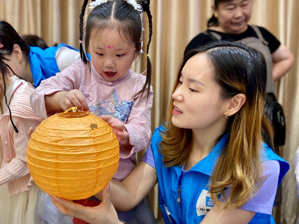 小朋友跟志愿者一起制作花燈。中建二局西南公司供圖