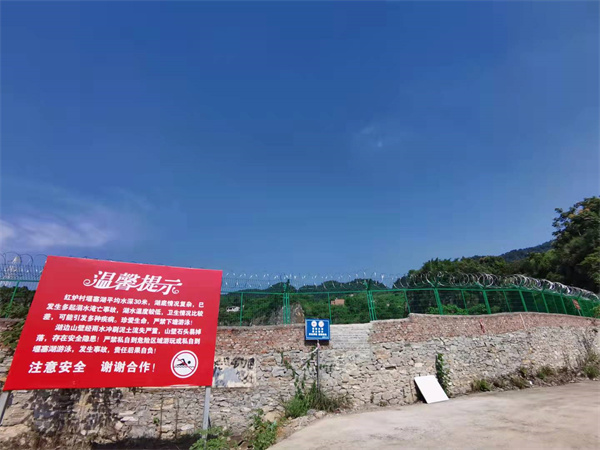 湖周邊筑起圍墻豎起警示牌,避免發生安全事故。李潔攝