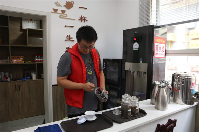 和美大院里,志愿者胡春正在給居民沏茶。陳家橋街道供圖