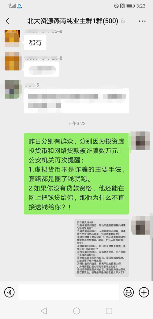 “事實上,很多電信詐騙都是發生在微信群中,比如刷單群、投資群!本琵埮沙鏊彼L馮牧介紹,“既然潛在受害人都是喜歡玩微信群聊的人,那么我們的宣防陣地也應該轉移到線上,各個小區業主群的群主都是小區的‘名人’,也時刻關注著群消息,他們的號召力和活躍度正是我們可以借助的力量!