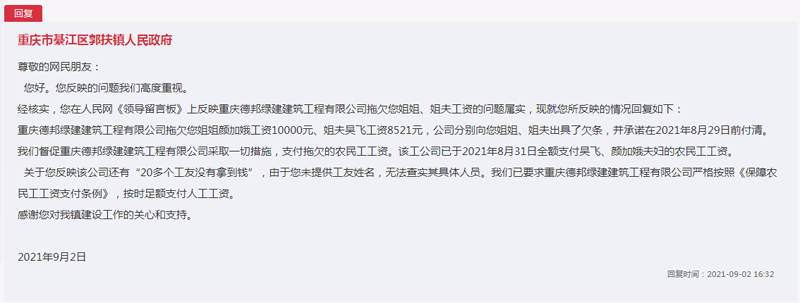 官方回復中稱:經核實,您在人民網《領導留言板》上反映重慶德邦綠建建筑工程有限公司拖欠姐姐、姐夫工資的問題屬實。我們督促該公司采取一切措施,支付拖欠的農民工工資。該公司已于2021年8月31日全額支付吳飛、顏加娥夫婦的農民工工資。同時,要求公司嚴格按照《保障農民工工資支付條例》,按時足額支付其余工友工資。感謝您對我鎮建設工作的關心和支持。