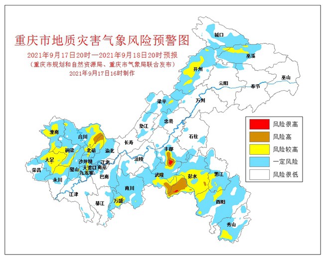 9月17日20時至9月18日20時,武隆區、彭水縣屬于風險很高地區,地質災害氣象風險等級為一級(紅色預警),合川區、北碚區、豐都縣、大足區屬于高風險地區,地質災害氣象風險等級為二級(橙色預警),巫溪縣、開州區、梁平區、黔江區、酉陽縣、秀山縣、萬盛經開區、南川區、潼南區、銅梁區、璧山區、永川區、渝北區、大渡口區、沙坪壩區、九龍坡區屬于風險較高地區,地質災害氣象風險等級為三級(黃色預警),云陽縣、奉節縣、城口縣、萬州區、石柱縣、忠縣、長壽區、墊江縣、涪陵區、榮昌區、江津區、綦江區、巴南區、南岸區、渝中區、江北區、兩江新區屬于一定風險地區,地質災害氣象風險等級為四級(藍色預警)。