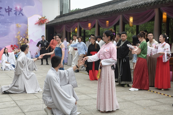 人民網重慶9月18日電 (胡虹)裙長曳地,高冠束發,婉約多姿的漢式裝扮……18日下午,由共青團江北區委主辦的“花好月圓·情定中秋”青年聯誼活動在鐵山坪森林公園舉辦。來自江北區機關、學校、醫院、非公企業、外地來江北求職青年等共計60余名單身男女歡聚一堂,在一片古風古韻中尋找自己未來的“另一半”。