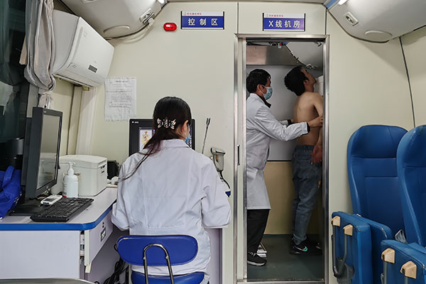 專業人員在體檢專用車內對職業工人展開檢查。黃華攝