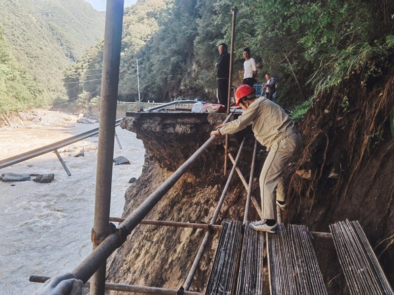9月20日,國網重慶城口供電公司工作人員通過臨時搭建的鋼管道路前往搶修現場。何成林攝