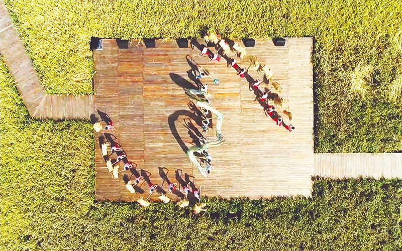 稻浪中央的舞臺上,一條以稻草編制的草把龍,在鼓點聲中昂頭游走。健碩的壯漢相互配合,龍身時而似飛沖云端,時而俯沖蜿蜒騰挪,神態活靈活現。