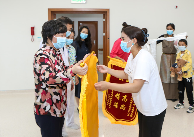 鄧莉副主任一行看望了來渝治療的15位患兒,并為他們送上嶄新的書包和文具。并與患兒家長熱情交談,詳細了解患兒恢復情況;純杭覍俅碜楷敽屯贩謩e向重慶市衛健委和重醫附屬兒童醫院贈送了錦旗,并獻上了潔白的哈達表示感謝。(陳琦、白楊)