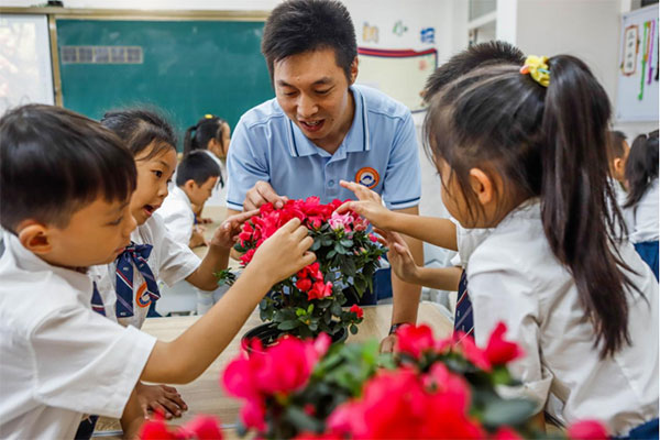 老師帶領孩子了解杜鵑花。重光小學供圖