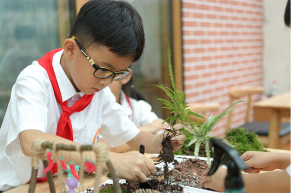 學生在課堂中運用苔蘚制作盆景。向詩佳攝
