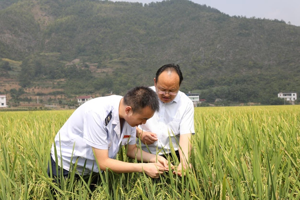 巫山縣天地農業開發有限公司負責人李尚前(右一)向稅務人員介紹水稻長勢。甘磊攝
