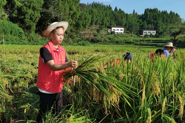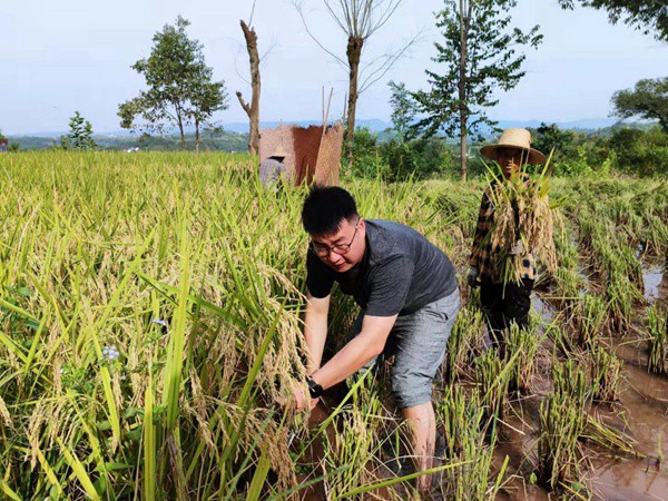 豐都縣稅務局駐村工作隊隊員湛林收割水稻。胡傳平攝