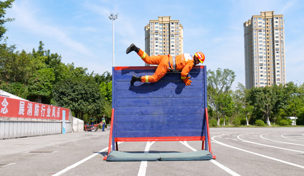 100米不長,可并不簡單:既要徒手翻越2米障礙板,又要雙手提兩盤水帶,負重過獨木橋,再快速準確地連接水帶、分水器和水槍。整套動作想要行云流水、一氣呵成,不容易。