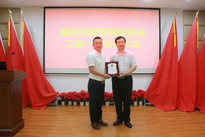 重慶市民營醫院協會秘書長戴軍(左)向協會總顧問、重慶市醫師協會會長趙興吉授牌。劉香瑩攝