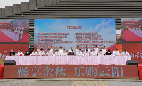 在開幕式上,重慶市軍糧供應中心、印度尼西亞SAK集團、中國銀行、中國石化集團、重慶川維化工有限公司、重慶厚德藥業有限公司、上海盒馬物聯網有限公司、重慶舸達裝飾工程有限公司等26家企業代表與天生云陽品牌管理公司、云陽鑫池農業公司、泥溪鎮協和村、泥溪鎮勝利村、三峽云海藥業股份有限公司、陳大毛面業發展有限公司、紅旗水泥有限公司簽訂了各類物資采購合同協議。