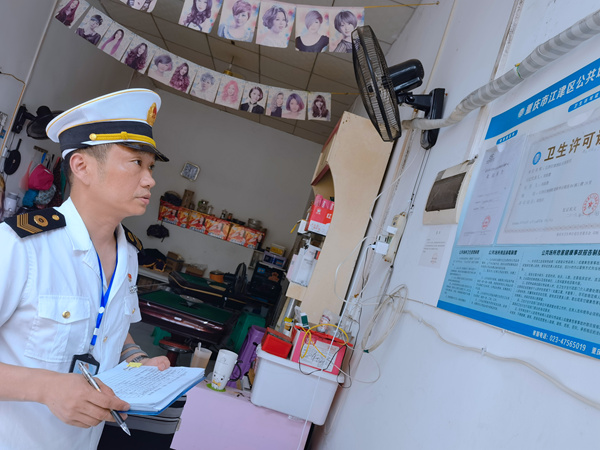 衛生監督員仔細查看公共場所衛生公示牌。江津區衛生健康綜合行政執法支隊供圖