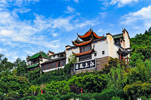 沿著碼頭拾階而上,漫步500多米的桃園街,遠遠看見標志石刻“江上風清”。這里就是云陽張飛廟。