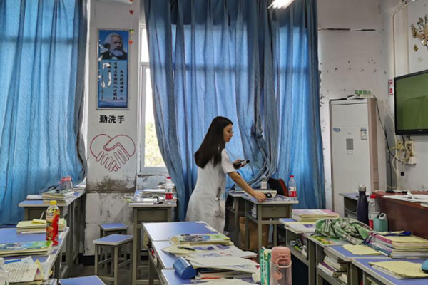 江津區疾控中心工作人員測量教室環境因素。張英攝