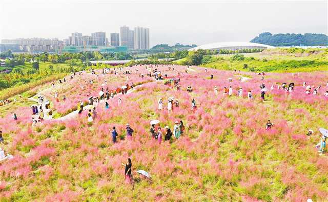 9月29日,兩江新區禮嘉智慧公園,市民在粉黛亂子草花海游玩。智慧公園的優美生態和眾多智慧體驗場景、智慧體驗項目,每天吸引2萬多游客前來打卡,爭相體驗“智慧+生態”的獨特魅力。