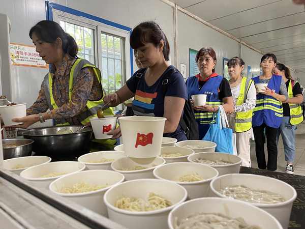 活動現場,一碗碗熱氣騰騰的面條在大家手中傳遞開來,氣氛十分熱烈!斑@是我堅守在工地的第三個國慶,項目部為我們煮的這碗面讓人感到特別溫暖!彼跛緳C佘習俊表示?粗鵁狒[的吃面場景,現任該項目工地項目經理馮吉感慨萬千:“由于項目工期緊、任務重,在這個特別的日子里,職工、工友們只能不停歇地堅守在一線,我們舉辦此次活動的初衷就是為了讓這些建設者既能感受到一個小‘家’的幸福美好,也能體會到背后有祖國這個大‘家’的強有力支撐!保▌⒄䦟、蔡渝潔)