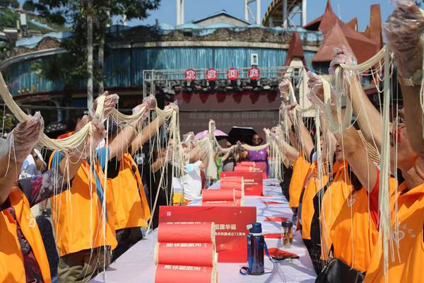 該景區還特別邀請了養老院的老人、周邊村落的老人、環衛工人、建筑工人和市民游客朋友們共同參加“慶生長桌宴”,免費品嘗全手工制作的“國慶長壽面”。長壽面總長72米,煮成100碗重慶特色小面,供游客們免費品嘗。