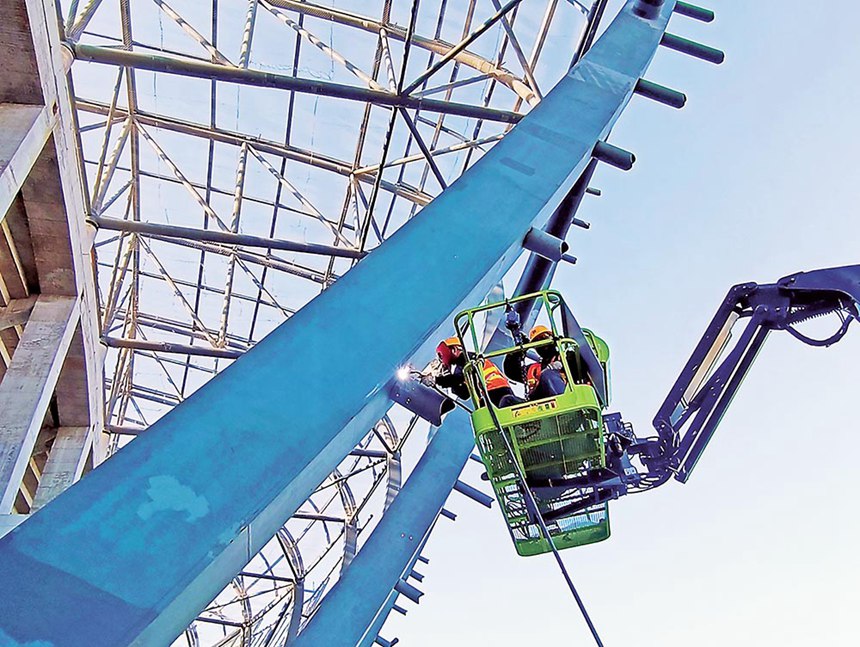 10月1日,重慶龍興足球場建設工地,工人正進行高空作業。(中建八局供圖)