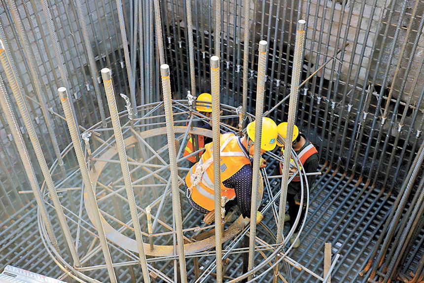 10月1日,重慶江北國際機場T3B項目工地,施工人員正在綁扎鋼筋。(中建八局供圖)