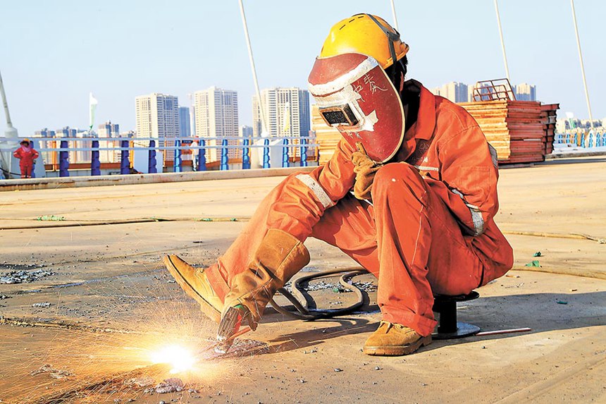 10月1日上午,白居寺長江大橋項目工地,焊接工人正在緊張工作。(中交二航局供圖)