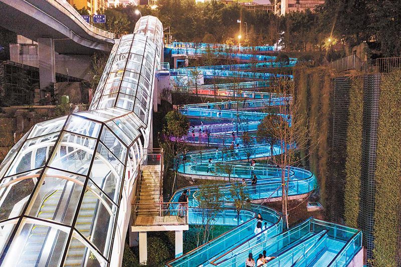 10月9日晚,渝中區東水門大橋北橋頭,無障礙景觀步道燈飾扮靚江岸。景觀步道連接陜西路和長濱路,已于國慶節前夕投用,市民通過步道可以快速到達湖廣會館。步道兩側和崖壁都栽種了不少植物,形成了一處極具山城特色的坡坎崖景觀。
